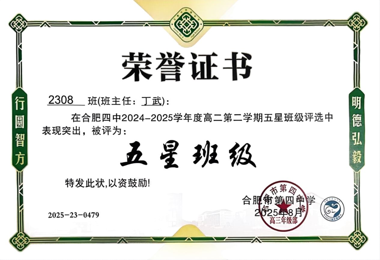 近日,在合肥四中2024-2025学年度高二第二学期星级班级评选结果揭晓,高三2308班(韬略八班)凭借出色的综合表现荣获“五星班级”誉称号。这份荣誉,属于班级每一位同学,也属于默默付出的全体老师。