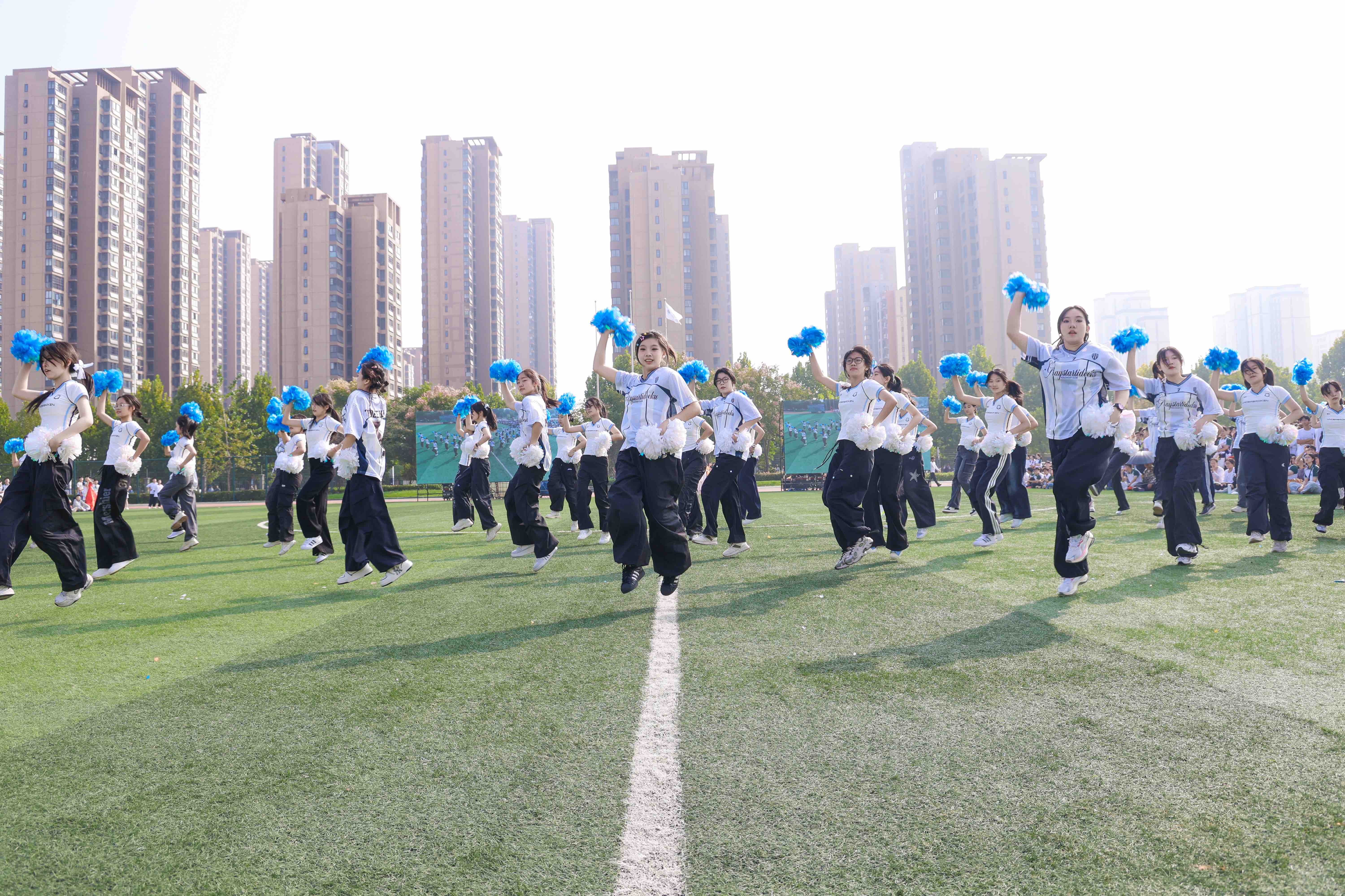 此次运动会开幕式表演,正是学校“五育融合”理念的集中展现。49名社员身着蓝白渐变表演服,以整齐划一的动作、富有张力的队形变换,将啦啦操的动感与艺术美感完美结合。每个创意造型,每一个细节都彰显着“power max”(极致力量)的团队精神,而表演中融入的即兴互动环节,则呼应了舞社名字中“X”所象征的无限可能——正如政策所倡导的“激发学生体育兴趣,培养终身运动习惯”,合肥四中将艺术活动、体育活动从“课堂必修”延伸为“成长刚需”,让学生在热爱中主动拥抱艺术与运动。