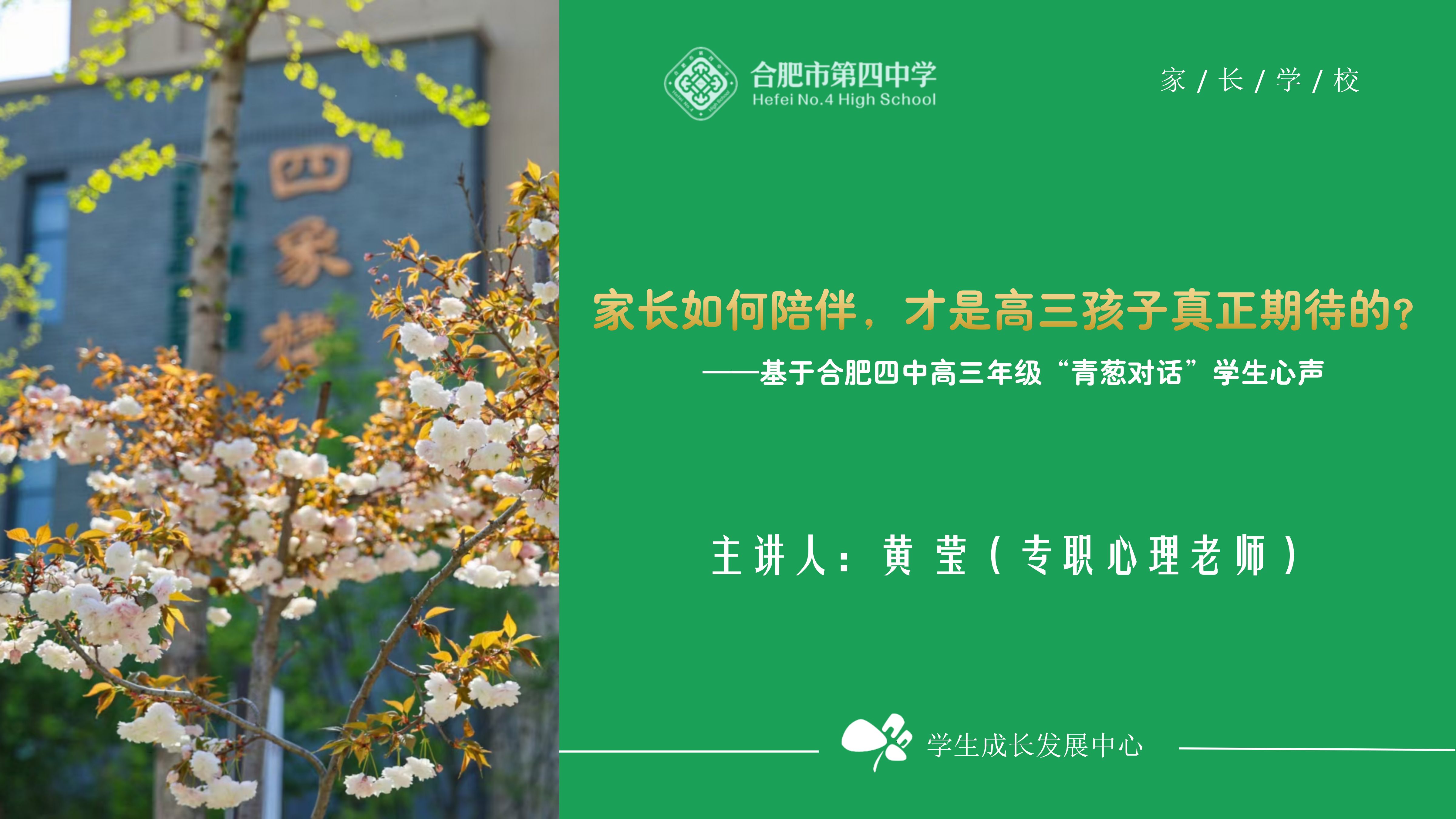 大家好!欢迎来到合肥四中家长学校!我是心理老师黄莹。值此国庆假期之际,我们特别为高三家长精心准备了这期微课,主题为《家长如何陪伴,才是高三孩子真正期待的?》。